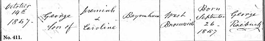 George was born on 26th September 1857, at Glover Street and baptised in the local Wesleyan-Methodist chapel at West Bromwich on 14th October.