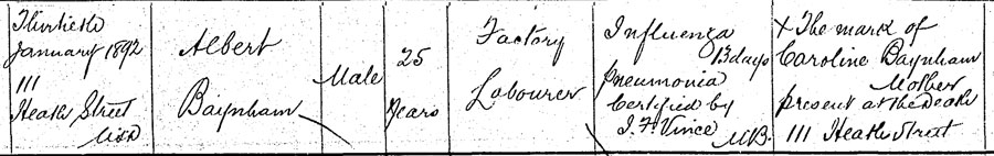 On 30th January 1892 Albert died of pneumonia, after a bout of influenza which had lasted 13 days. He was still living at the family home in Heath Street and working as a factory labourer; he was unmarried and aged just 25.